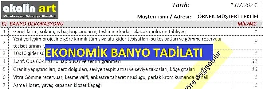 Banyo tadilat maliyeti, banyonuzun büyüklüğüne ve seçeceğiniz ürünlerin kalite sınıfına göre 160.000 TL ile 320.000 TL arasında değişebilir.